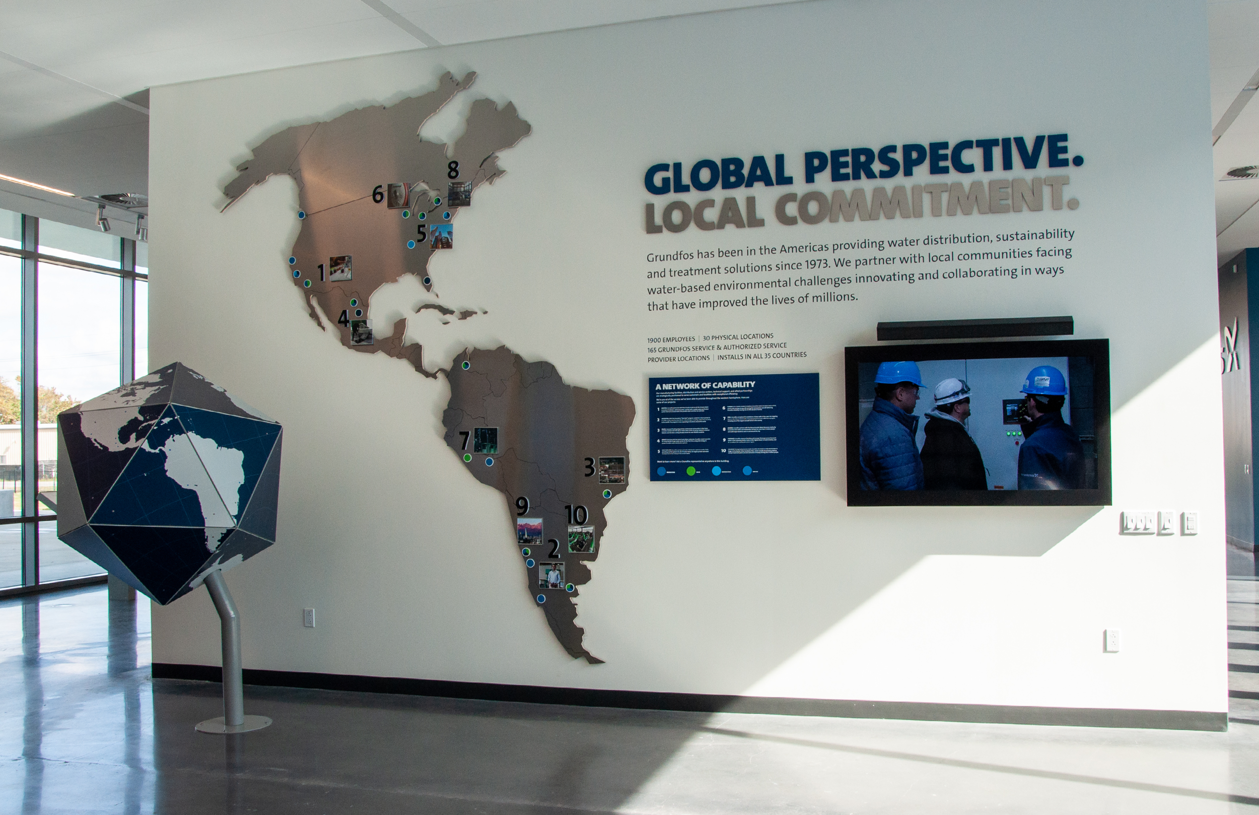 We were asked to partner with an architecture firm to design an innovative experience in the first floor of the new North American headquarters for Grundfos in Brookshire, Texas. We created interactive spaces that explored the company’s history, North American footprint, and sustainability efforts.
