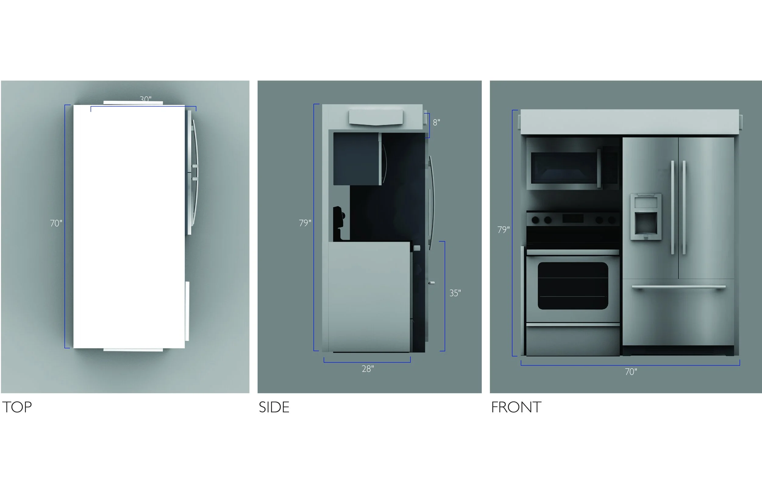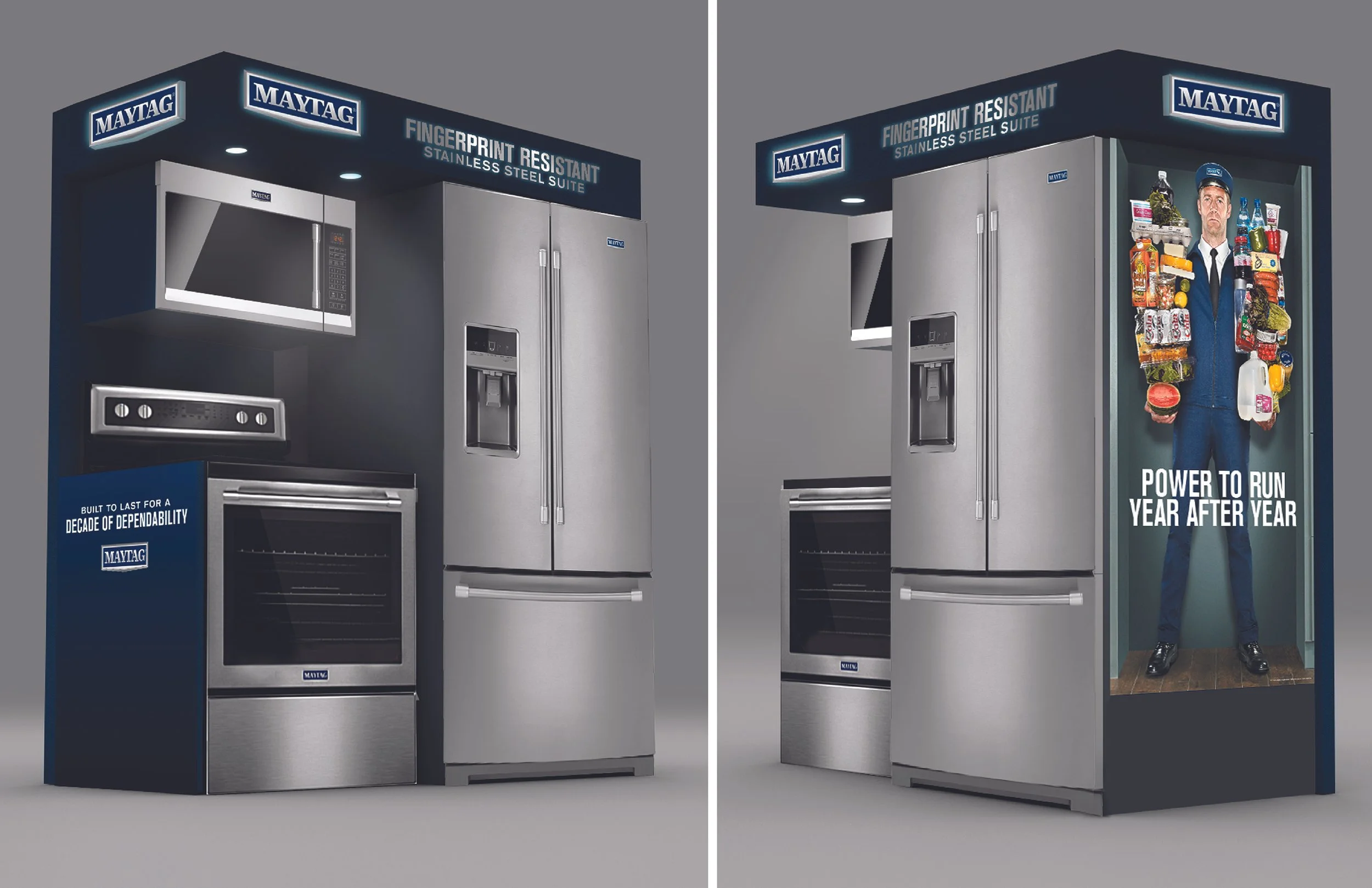 The header utilizes dimensional, backlit elements for branding and recessed lighting to illuminate the microwave and range. A lenticular was proposed to add motion to the Maytag Man, animating his legs to imitate running in place.